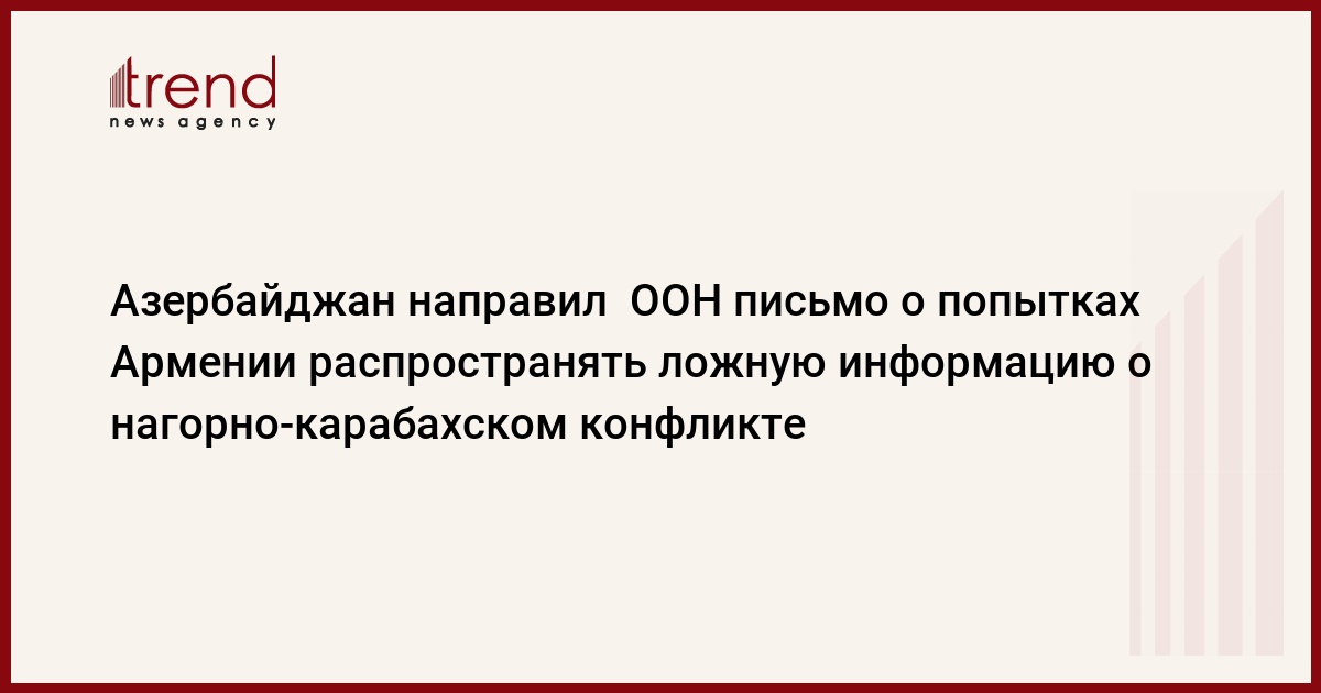 В обращении глава азербайджанского поспредставительства в ООН заявляет, что в своих резолюциях номер 822, 853, 874 и 884 от 1993 года Совет Безопасности осудил применение силы против Азербайджана, оккупацию его территорий и подтвердил уважение суверенитета и территориальной целостности Азербайджанской Республики, нерушимости его международно признанных границ и недопустимость применения силы для захвата территории. В ответ на территориальные претензии и насильственные действия Армении Совет Безопасности вновь подтвердил, что Нагорно-Карабахский регион является неотъемлемой частью Азербайджанской Республики, и потребовал немедленного, полного и безоговорочного вывода оккупационных сил со всех захваченных территорий Азербайджана. В декларации, утвержденной 4 ноября 1993 года девятью странами Минской группы СБСЕ (ныне ОБСЕ) в связи с расширением территориальных захватов вооруженными силами Армении, несмотря на резолюции Совета Безопасности, в частности, отмечалось, что "приобретение территорий силой не может быть признано, и оккупация территорий не может быть использована для получения международного признания или навязывания изменения их правового статуса".