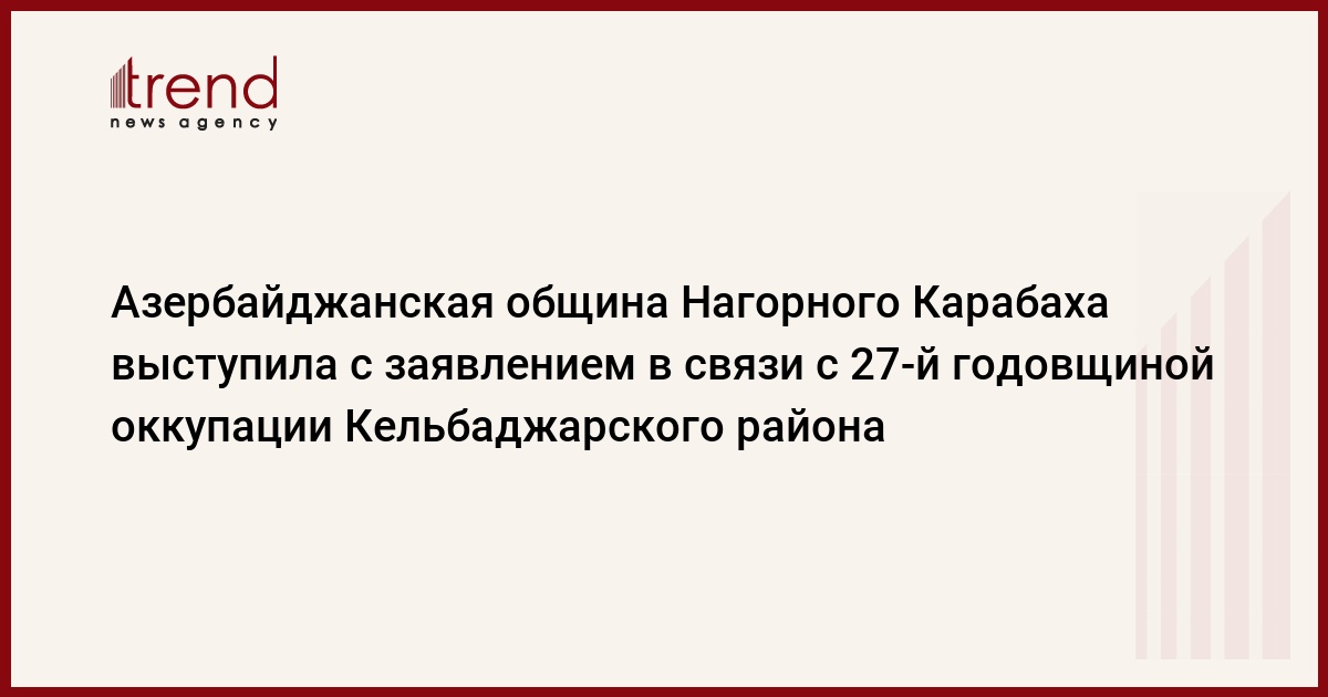 В 27-ю годовщину оккупации Кельбаджарского района армянскими вооруженными силами свыше 80 тысяч азербайджанцев Нагорно-Карабахского региона Азербайджана, а также свыше 76 тысяч из Кельбаджарского района призывают мировое сообщество поддержать справедливую позицию Азербайджана для дачи объективной политико-правовой оценки продолжающейся по сей день агрессии Армении против азербайджанского народа.