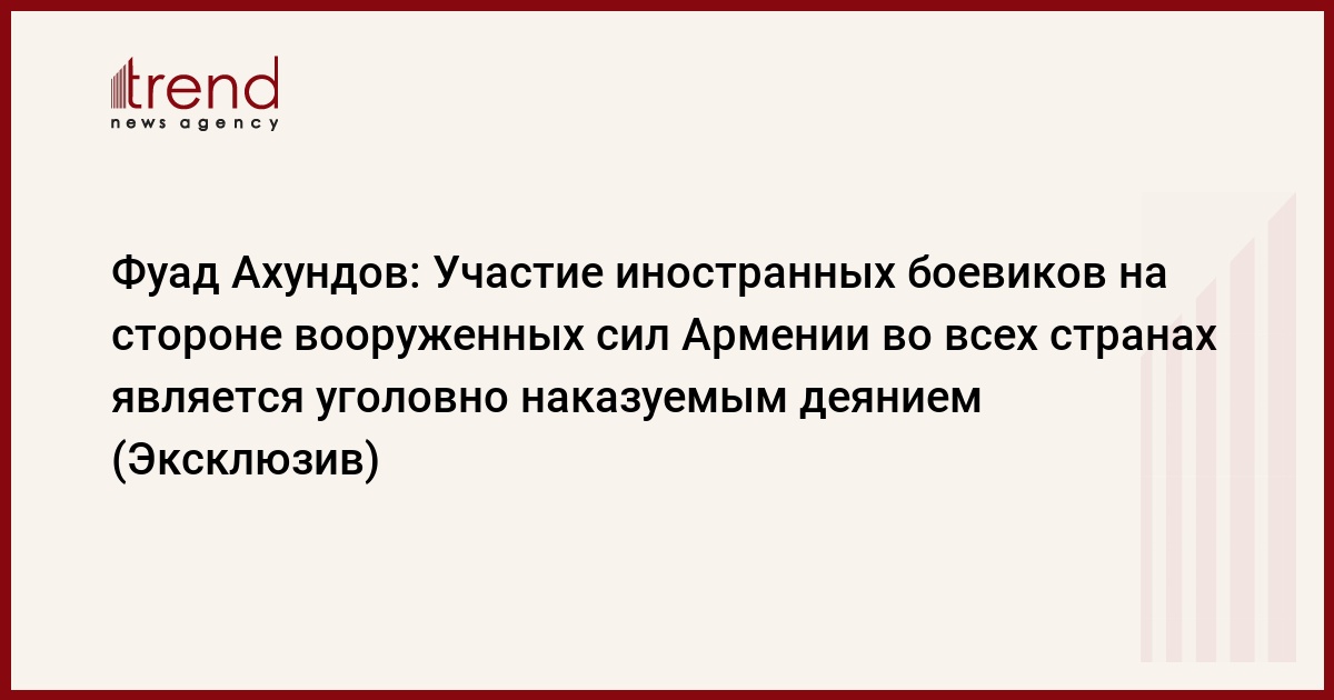 БАКУ /Trend/ - Участие армянских боевиков на стороне вооруженных формирований является террористической деятельностью. Об этом сказал в эксклюзивном интервью Trend заведующий сектором по работе с зарубежными СМИ и НПО Администрации Президента Азербайджана Фуад Ахундов.