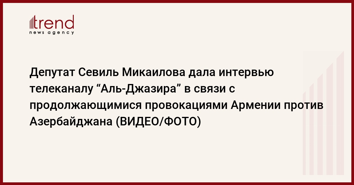 БАКУ /Trend/ - Депутат Милли Меджлиса (парламент) Азербайджана Севиль Микаилова дала интервью телеканалу “Аль-Джазира” в связи с продолжающимися провокациями Армении против Азербайджана и обострением ситуации на линии фронта, сообщает в воскресенье Trend.
