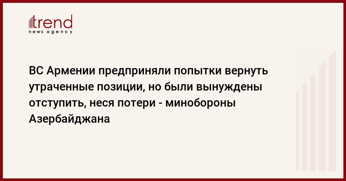 БАКУ /Trend/ - ВС Армении предприняли попытки вернуть утраченные позиции, но были вынуждены отступить, неся потери, сообщает в субботу Trend со ссылкой на минобороны Азербайджана.