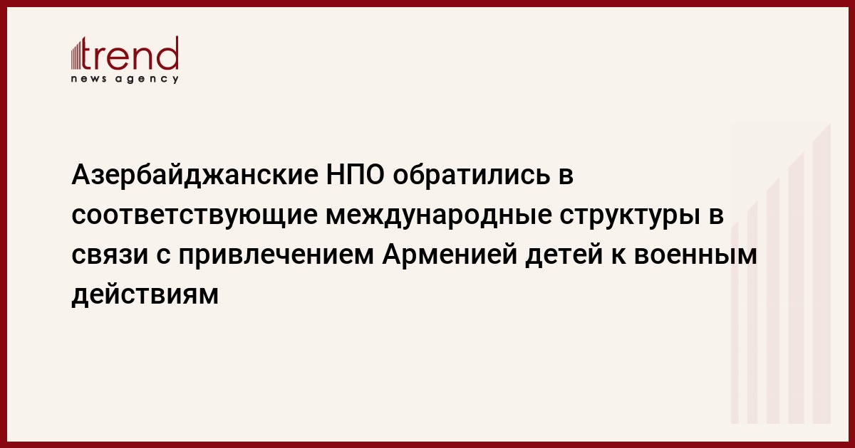 БАКУ /Trend/ - Действующие в Азербайджане неправительственные организации обратились к исполнительному директору ЮНИСЕФ, председателю Правления Международной организации по спасению детей, президенту Международного бюро по правам ребенка, президенту Международных детских деревень SOS, исполнительному директору Глобального фонда для детей в связи с использованием Арменией на войне детей, не достигших 15-летнего возраста.