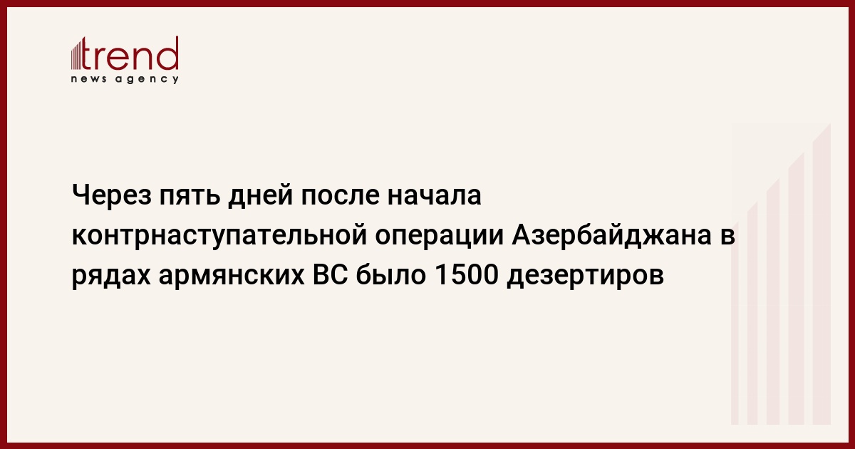 БАКУ /Trend/ - Уже через пять дней после начала контрнаступательной операции Азербайджана, в рядах армянских ВС насчитывалось уже 1500 дезертиров, сообщил бывший глава Генштаба ВС Армении, бывший начальник контрольной службы Минобороны генерал-полковник Мовсес Акопян, передает Trend со ссылкой на армянские СМИ.