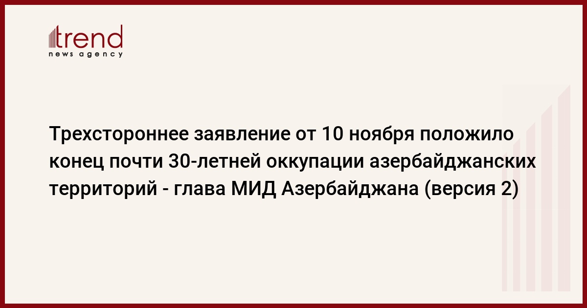 БАКУ /Trend/ - Трехстороннее заявление по нагорно-карабахскому конфликту, подписанное 10 ноября 2020 года, положило конец почти 30-летней армянской оккупации азербайджанских территорий.