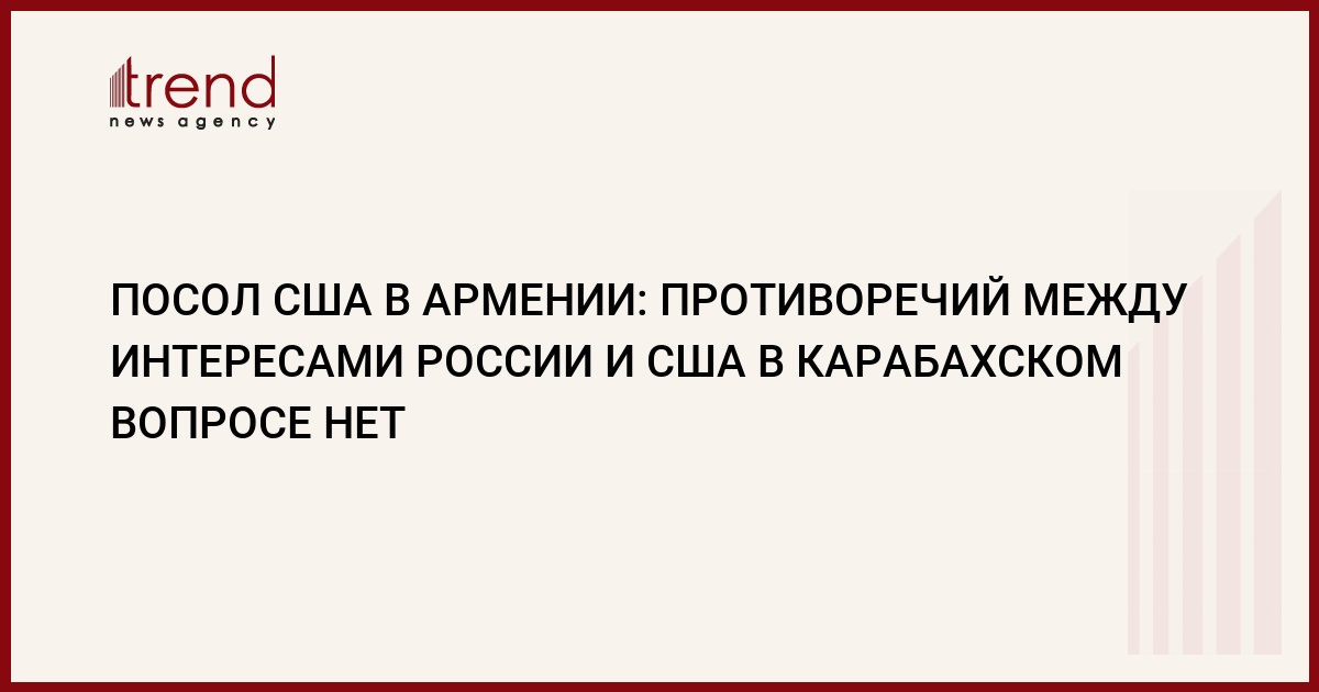 (АРКА) Противоречий между интересами России и США в карабахском вопросе нет. Об этом заявил сегодня в Ереване Чрезвычайный и Полномочный посол США в Армении Джон Эванс, в ходе семинара Парламентской Ассамблеи HАТО "Роуз Рот". Он отметил исключительно хорошую работу Минской группы ОБСЕ в вопросе урегулирования карабахской проблемы. "Обвинить Минскую группу в неконсолидированной работе нельзя",- отметил он. Дж. Эванс подчеркнул и важную роль парламентов в урегулировании конфликта.