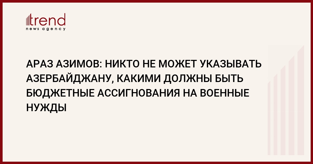 Hикто не может указывать Азербайджану, какими должны быть бюджетные ассигнования на военные нужды. Увеличивая оборонные расходы, официальный Баку основывается лишь на собственных ресурсах. Об этом, как предает Trend , 12 октября в беседе с журналистами заявил заместитель главы МИД Азербайджана Араз Азимов, комментируя заявления официальных лиц Армении об угрозе военного дисбаланса в связи с увеличением оборонных расходов Азербайджана.