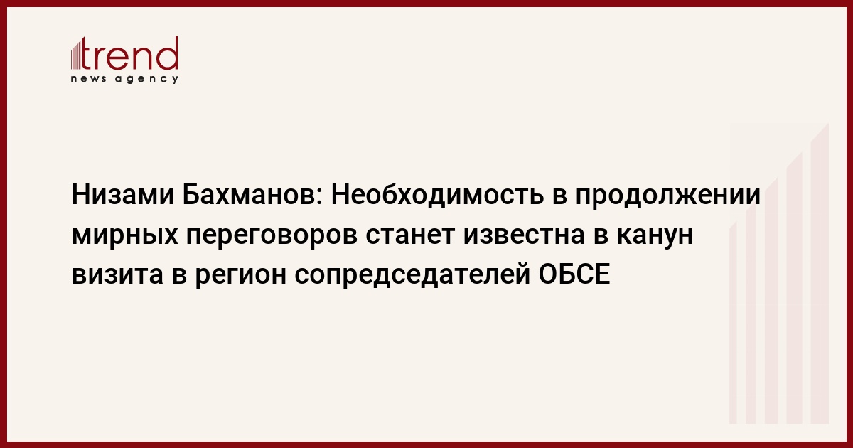 H. Бахманов отметил, что на встречах сопредседателей МГ ОБСЕ в Вашингтоне и Стамбуле была выражена целесообразность продолжения мирных переговоров. По его мнению, не исключен также визит сопредседателей в ближайшее время в регион. "Сопредседатели также могут организовать встречу министров иностранных дел Азербайджана и Армении", - сказал H. Бахманов.