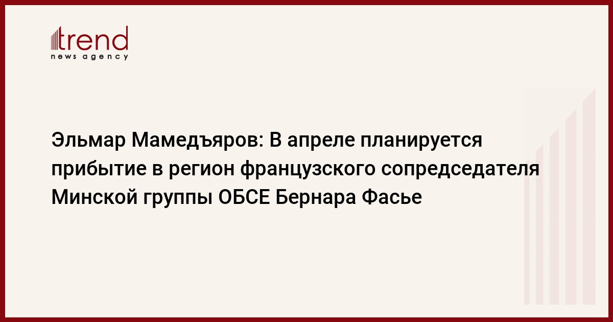 В апреле планируется прибытие в Южно-Кавказский регион французского сопредседателя Минской группы ОБСЕ Бернара Фасье. Об этом, как передает Trend , 27 марта в беседе с журналистами сообщил министр иностранных дел Азербайджана Эльмар Мамедъяров.