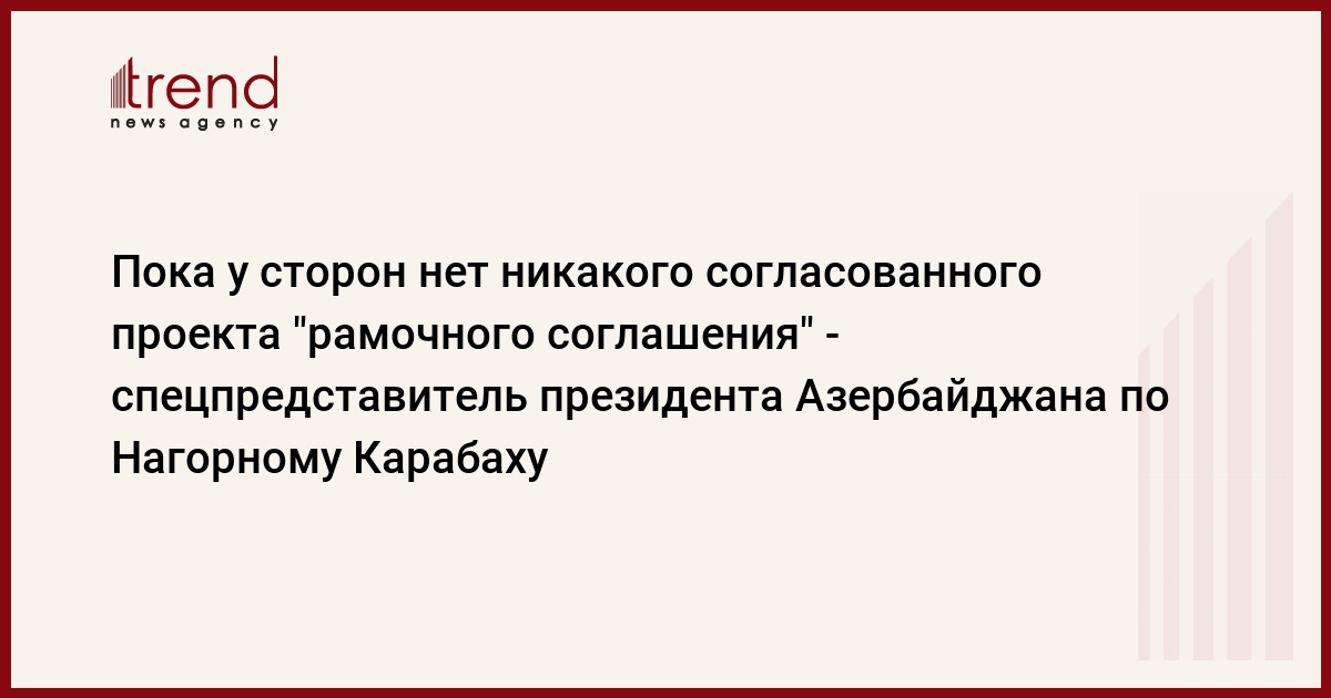 Hа переговорном столе нет никакого готового проекта "рамочного соглашения", который можно было бы вынести на подписание. Об этом, как передает Trend , 3 июля заявил журналистам спецпредставитель президента Азербайджана по нагорно-карабахской проблематике, заместитель министра иностранных дел Азербайджана Араз Азимов.