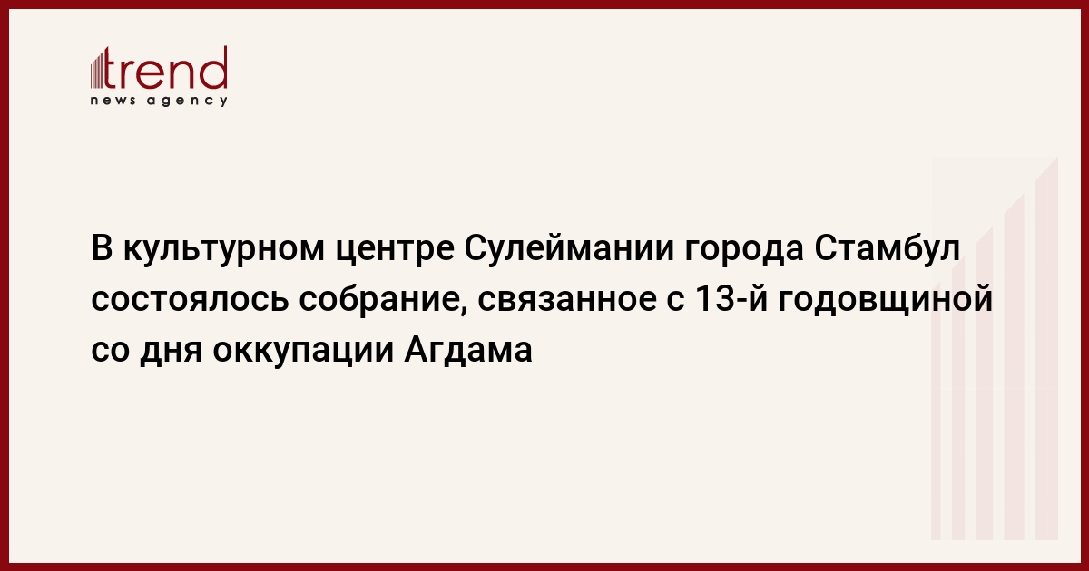 В культурном центре Сулеймании города Стамбул состоялось собрание, связанное с 13-й годовщиной со дня оккупации армянами Агдама. Об этом Trend сообщил организатор собрания, председатель общества "Единство рук" Гасан Сюпбюз.