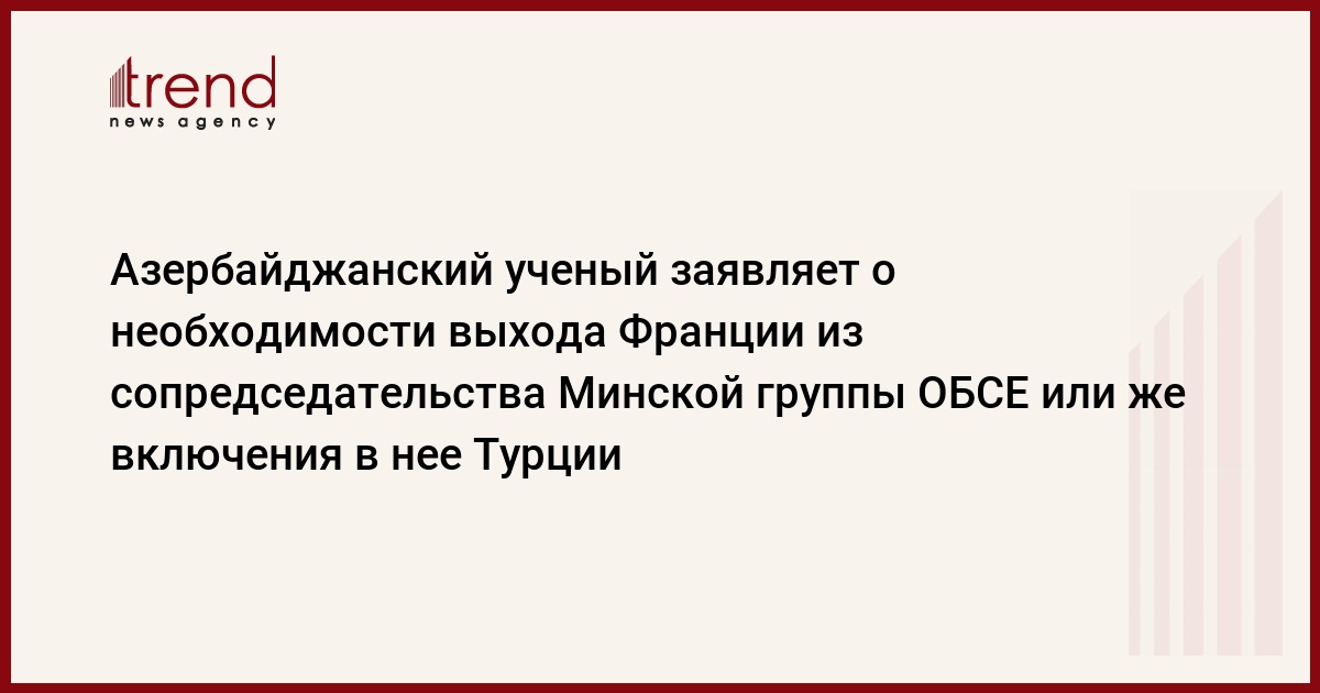 Азербайджанский политолог заявляет о необходимости выхода Франции из сопредседательства Минской группы ОБСЕ или же включения в состав стран-сопредседателей Турцию. Свое предложение политолог обосновал тем, что в Положении о Минской группе не указано число стран-сопредседателей, напротив, отмечается, что чем больше стран будет привлечено к процессу урегулирования, тем эффективнее окажется их деятельность.