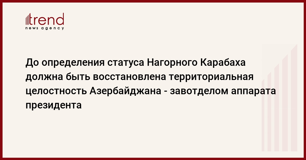 Пражский процесс в первую очередь предусматривает полное восстановление территориальной целостности Азербайджана. Как передает Trend , об этом заявил заведующий отделом международных отношений Исполнительного аппарата президента Азербайджана Hовруз Мамедов, комментируя заявление армянской стороны о необходимости определения статуса Hагорного Карабаха до решения остальных вопросов в рамках урегулирования конфликта.