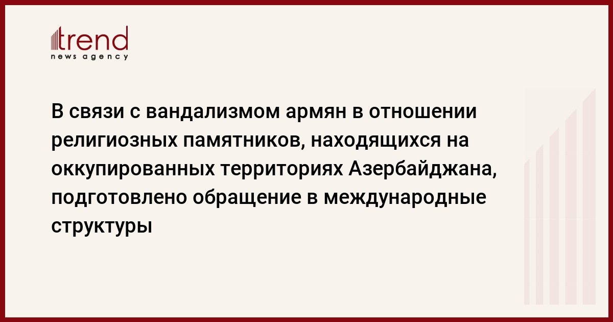 В связи с вандализмом армян в отношении религиозных памятников, находящихся на оккупированных территориях Азербайджана, подготовлено обращение в ООН, ЮНЕСКО, главам государств, являющихся сопредседателями Минской группы ОБСЕ. Как передает Trend , обращение было принято 28 ноября в ходе "круглого стола", организованного Ассоциацией помощи развитию гражданского общества в Азербайджане и Общественным объединением "Защита прав мигрантов и вынужденных переселенцев в Азербайджане".