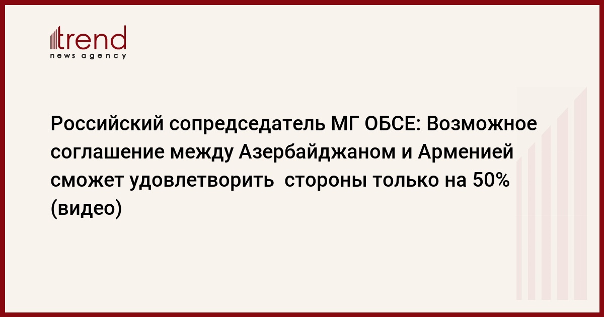 Азербайджан, Баку /корр. Trend А.Исмайлова/ Российский сопредседатель Минской группы ОБСЕ по урегулированию нагорно-карабахского конфликта Юрий Мерзляков заявил в среду в Баку, что возможное соглашение между Азербайджаном и Арменией сможет удовлетворить стороны только на 50%.