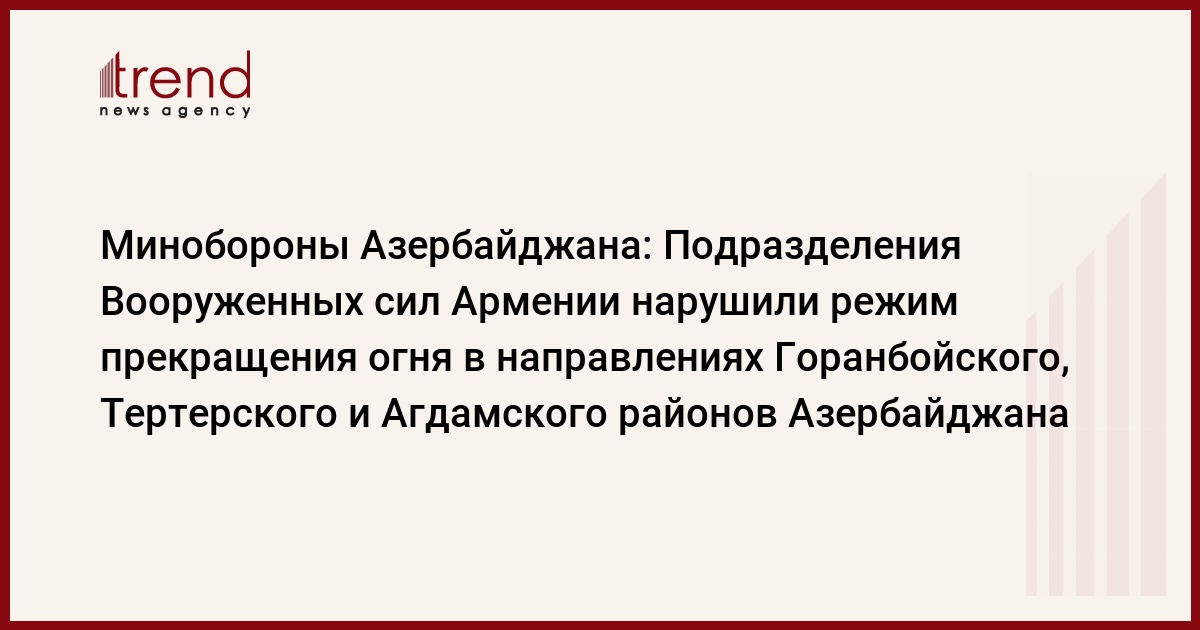 Азербайджан, Баку /корр. Trend К.Зарбалиева/ Подразделения Вооруженных сил Армении 14 августа с 01:50 до 05:15 с постов, дислоцированных в трех километрах от юго-западной части селения Борсунлу Тертерского района, в двух километрах от юго-восточной части селения Тапгарагойунлу Горанбойского района, в двух километрах от юго-восточной части селения Башгервенд, в двух с половиной километрах от юго-восточной части селения Шурабад Агдамского района подвергли автоматному и пулеметному обстрелу противоположные позиции Национальной армии Азербайджана, сообщили во вторник в пресс-службе Министерства обороны АР.
