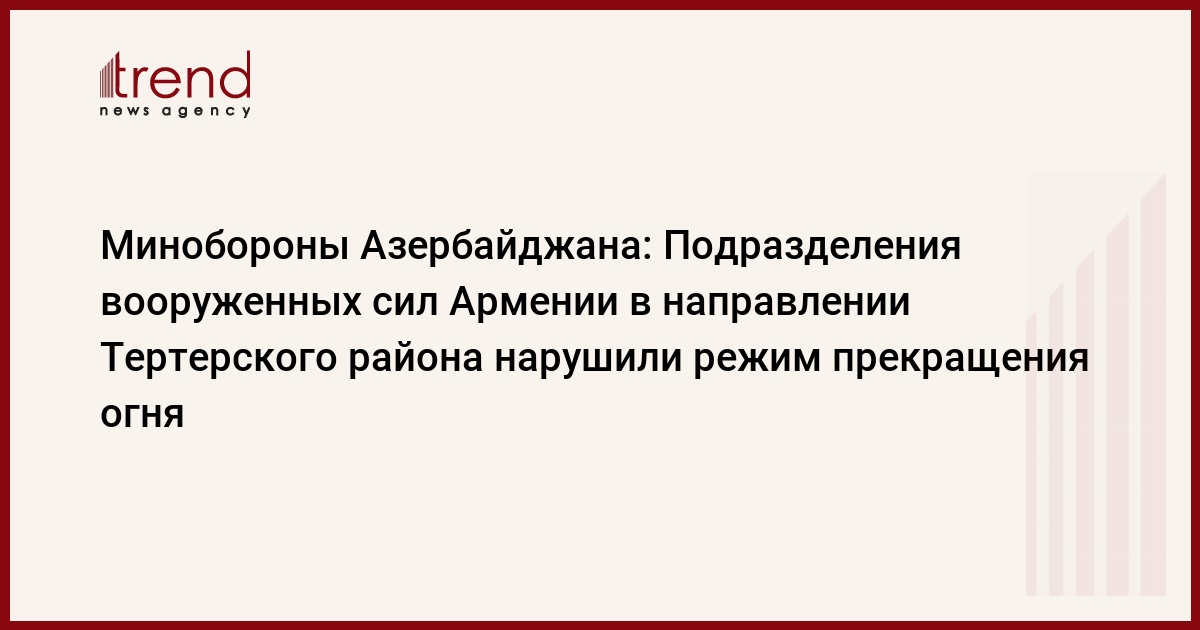 Азербайджан, Баку /корр. Trend К.Зарбалиева / Подразделения Вооруженных сил Армении в направлении Тертерского района нарушили режим прекращения огня. Об этом в пятницу сообщили в пресс-службе Министерства обороны Азербайджана.