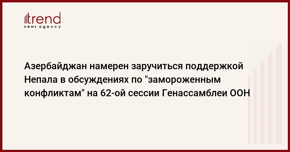Азербайджан, Баку / корр. Trend корр. С.Агаева/ Азербайджан намерен заручиться поддержкой Непала в обсуждениях по "замороженным конфликтам" на территориях стран-членов ГУАМ на 62-ой сессии Генеральной Ассамблеи ООН. Об этом в четверг по телефону из Непала сообщил Чрезвычайный и Полномочный Посол Азербайджана в Непале Тамерлан Гараев.
