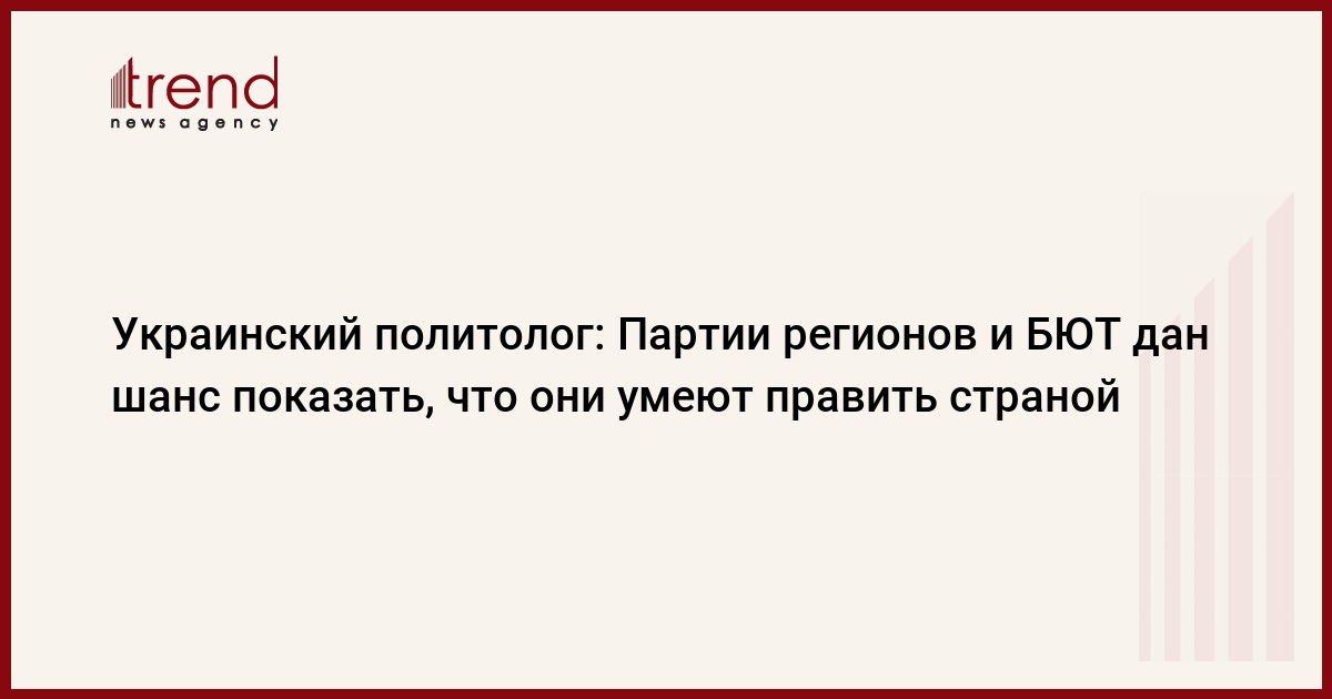 Азербайджан, Баку /корр. Trend А.Гасымова/ Партии регионов и Блоку Юлии Тимошенко дан шанс показать, что они могут управлять страной. "Результаты выборов на Украине показывают, что на Украине в данный момент действую две равные политические силы и им сейчас дан шанс показать, что они могут управлять страной и удерживать экономику на подъеме", - сказал украинский политолог, директор Киевского Центра политических исследований и конфликтологии Михаил Погребинский.