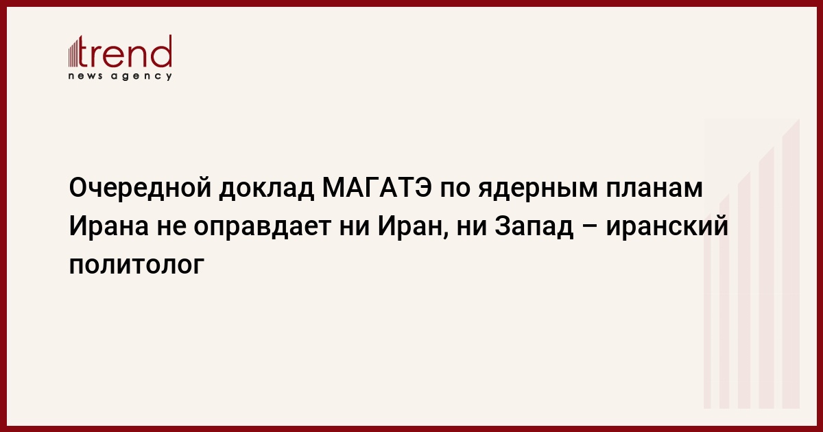 Азербайджан, Баку /корр. Trend Д.Хатыноглу/ "Новый доклад, который готовит МАГАТЭ по ядерным планам Ирана, не оправдает ни Иран, ни западные страны, обвиняющие его в создании ядерного оружия", - считает иранский политолог Ахмед Зейдабади.