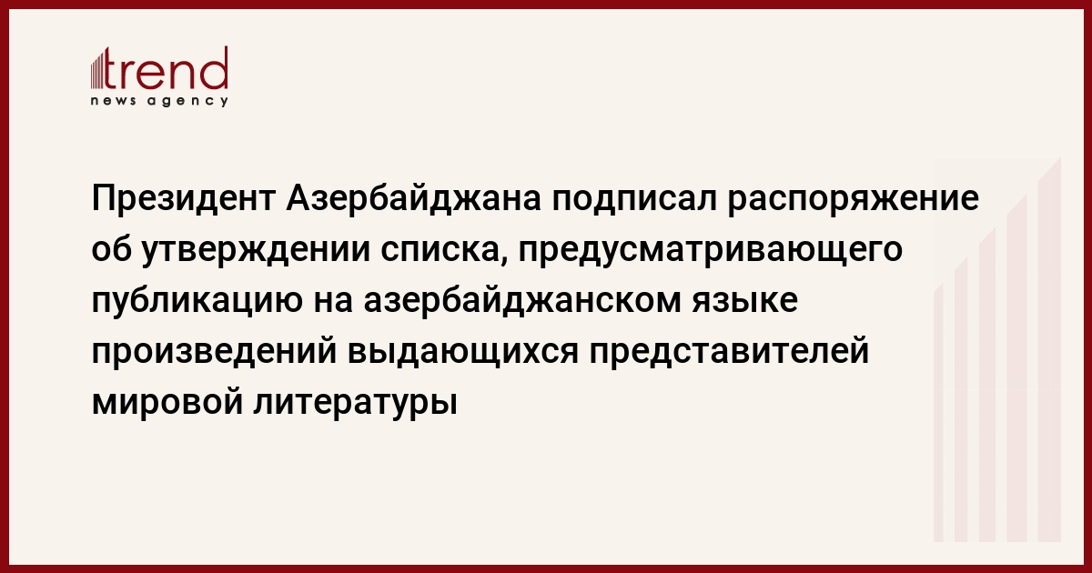 Азербайджан, Баку / Trend / Президент Азербайджана Ильхам Алиев подписал распоряжение об утверждении списка, предусматривающего публикацию на азербайджанском языке произведений выдающихся представителей мировой литературы, входящих в 150-томную "Библиотеку мировой литературы". Согласно распоряжению Национальная Академия Наук Азербайджана в течение месяца представит Исполнительному аппарату президента Азербайджана предложения по переводу, составлению и подготовке к публикации произведений, входящих в 150-томник.