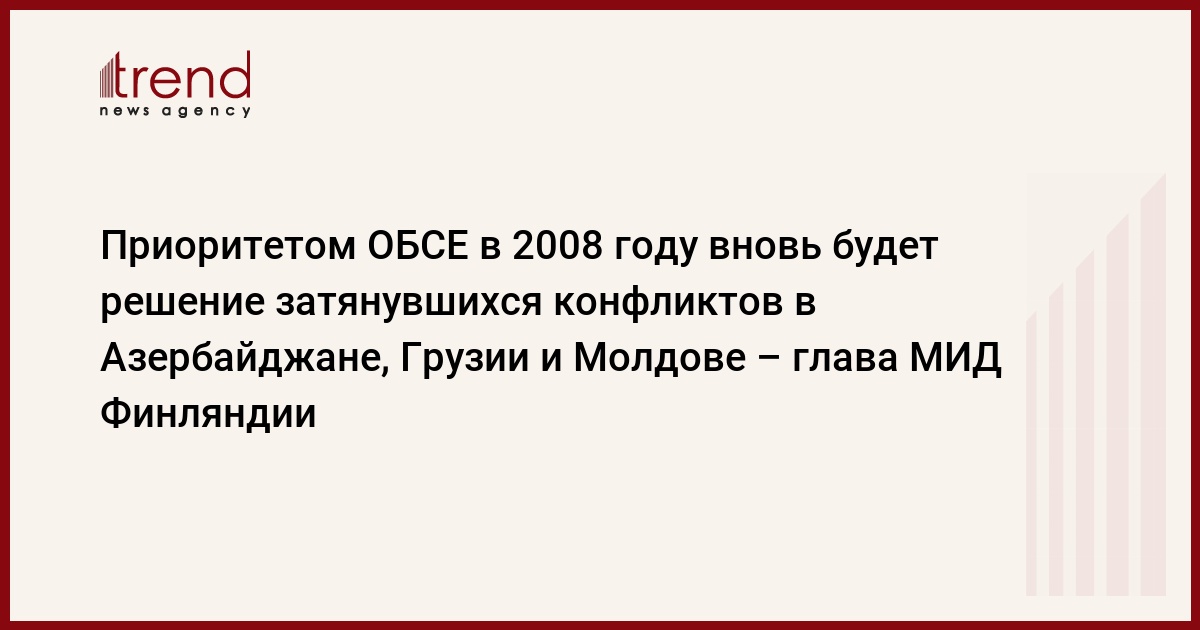 Азербайджан, Баку, 14 февраля /корр. Trend К.Рамазанова/ Приоритетом ОБСЕ в 2008 году вновь будет решение затянувшихся конфликтов в Азербайджане, Грузии и Молдове. Об этом сказал в среду в Вашингтоне действующий председатель ОБСЕ, глава МИД Финляндии Илкка Канерва во время выступление в Хельсинской Комиссии США.