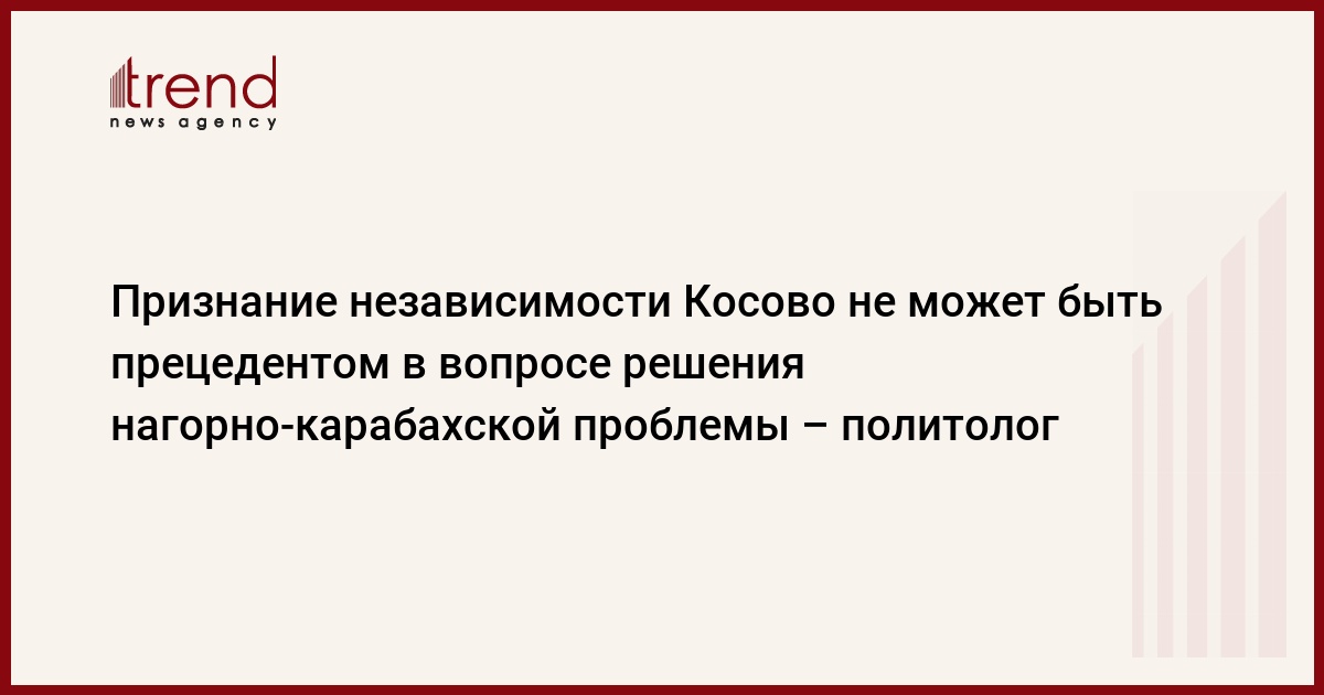 Азербайджан, Баку, 17 февраля /корр. Trend Э.Гусейнли /Член азербайджанской делегации в ПАСЕ, политолог Айдын Мирзазаде считает, что признание независимости Косово не может быть прецедентом в вопросе решения нагорно-карабахской проблемы. "Вне зависимости от заявлений Сержа Саркисяна и других руководителей Армении, международное сообщество не признает Нагорный Карабах в качестве независимого государства", - сказал в воскресенье в интервью Trend Мирзазаде.