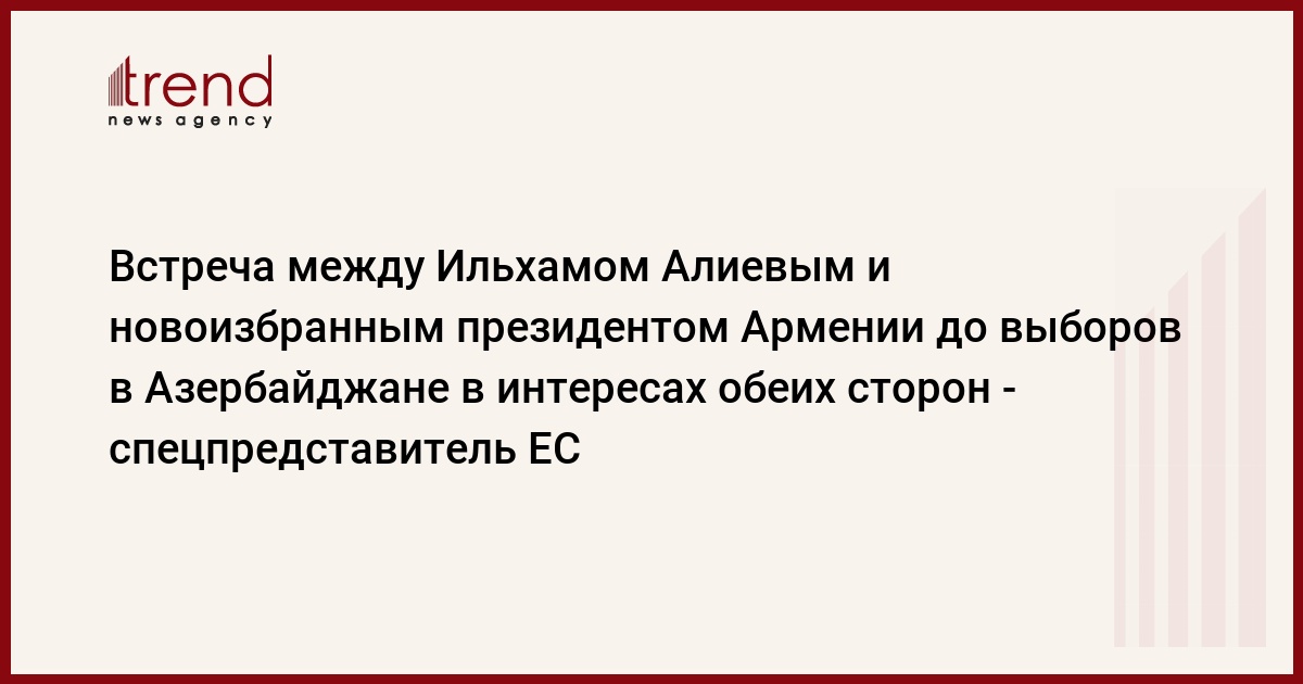 Франция, Страсбург, 23 февраля /корр. Trend А.Магеррамли/ "Считаю, что встреча между президентом Ильхамом Алиевым и новоизбранным президентом Армении до выборов в Азербайджане в интересах обеих сторон. Ведь oни должны узнать друг друга. Я надеюсь, что встреча состоится". Об этом в беседе с журналистами в Страсбурге заявил спецпредставитель Евросоюза на Южном Кавказе Питер Семнеби.