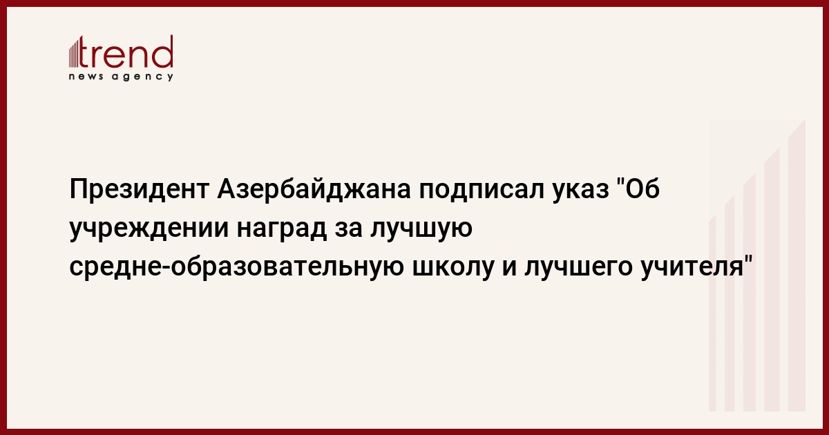 Азербайджан, Баку, 25 февраля / Trend / Президент Азербайджанской Республики Ильхам Алиев подписал указ "Об учреждении наград за лучшую средне-образовательную школу и лучшего учителя". Выплата расходов для наград за лучшую средне-образовательную школу и лучшего учителя будет обеспечиваться за счет средств, предусмотренных для министерства образования Азербайджанской Республики в централизованных расходах государственного бюджета. Решение вытекающих из указа вопросов поручается Кабинету министров.