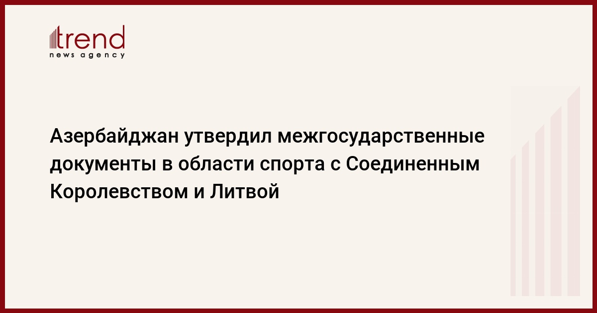 Азербайджан, Баку, 11 марта /. Trend / 10 марта президент Азербайджана Ильхам Алиев подписал Распоряжения об утверждении соглашения о сотрудничестве между Министерством молодежи и спорта АР и Министерством социальной безопасности и труда Литвы в области молодежной политики, а также меморандума взаимопонимания со Спортивным советом Соединенного Королевства о сотрудничестве в области спорта.