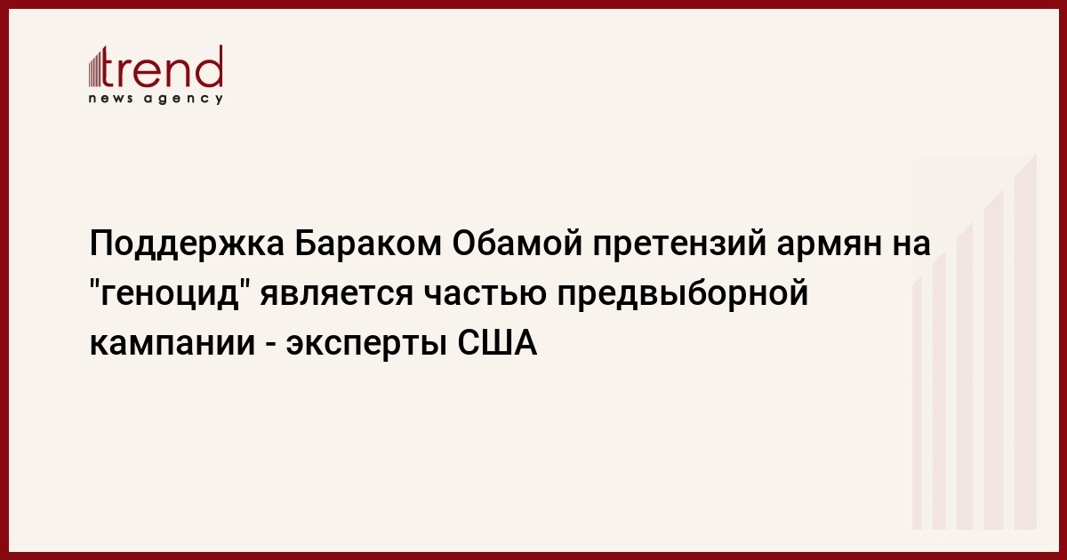 Азербайджан, Баку, 27 июня /корр. Trend С.Ильхамгызы/ Эксперты США считают, что поддержка реальным кандидатом в президенты США Бараком Обамой претензий армян на так называемый "геноцид" против них Османской империей, и обещания признать его - всего лишь составная часть его предвыборной кампании.