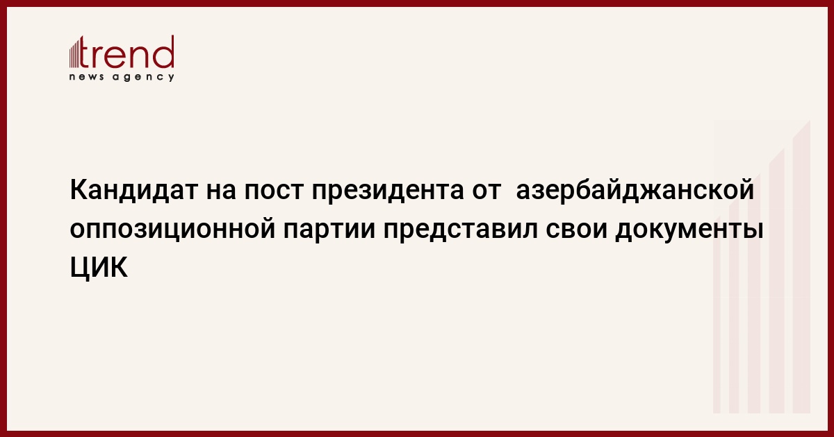 Президентские выборы в Азербайджане пройдут 15 октября. В июле три оппозиционные партии (Народного фронта, Либеральная, Граждан и развития), представленные в блоке "Азадлыг", а также партия Классического народного фронта, приняли решение бойкотировать выборы. В конце прошлой недели правящая партия "Ени Азербайджан" выдвинула кандидатуру нынешнего главы государства Ильхама Алиева. Партии "Мусават", Гражданской солидарности, Демократическая, Великого Созидания отказались участвовать в выборах со своим кандидатом. Свои кандидатуры на пост президента официально выдвинули председатели партий Зеленых, Народного фронта Единого Азербайджана, "Современный Мусават", Либерально-демократической, "Умид" - Маис Гюльалиев, Гудрат Гасангулиев, Хафиз Гаджиев, Фуад Алиев, Игбал Агазаде.
