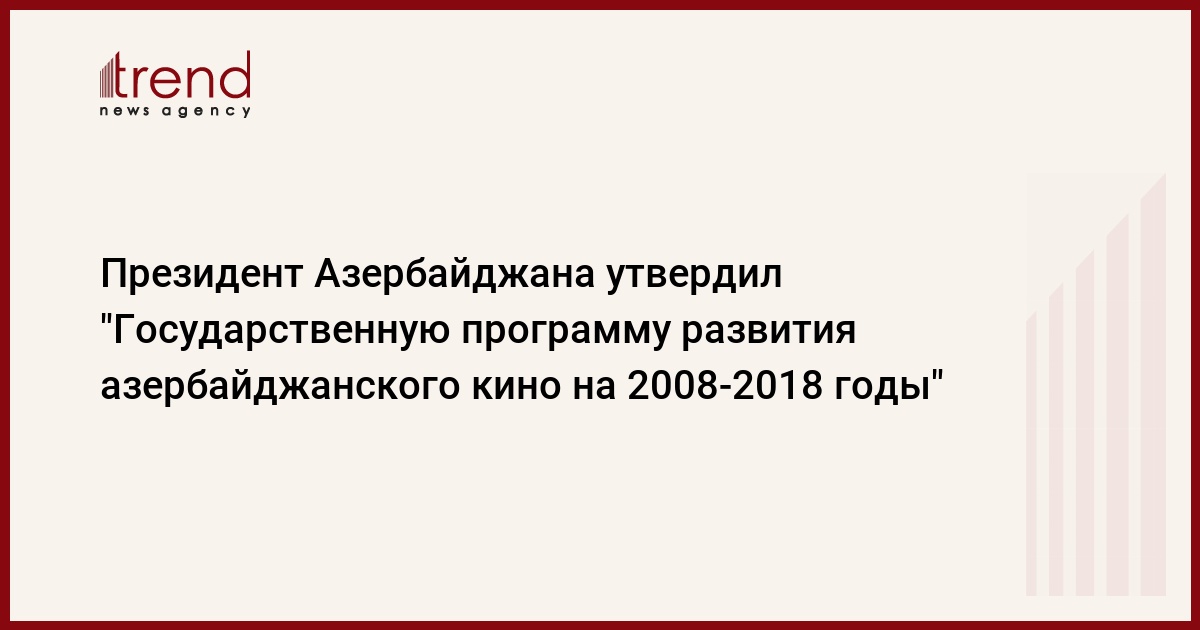 Азербайджан, Баку, 4 августа/ Trend / Президент Азербайджана Ильхам Алиев утвердил "Государственную программу развития азербайджанского кино на 2008-2018 годы".