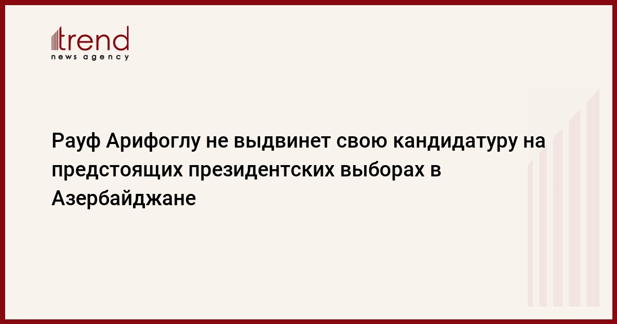 Азербайджан, Баку, 8 августа /корр. Trend Э.Бабаев/ Член азербайджанской оппозиционной партии "Мусават", главный редактор газеты "Ени Мусават" не выдвинет свою кандидатуру на предстоящих в стране президентских выборах. "Для того, чтобы поставить точку ненужным спекуляциям на эту тему, чтобы не создавать растерянности среди членов партии "Мусават" и многотысячных читателей "Ени Мусават", чтобы не допустить клевету провокаторов, я ставлю точку в этом вопросе и заявляю, что не будут баллотироваться в президенты Азербайджана", - говорится в заявлении Арифоглу поступившем Trend в пятницу.