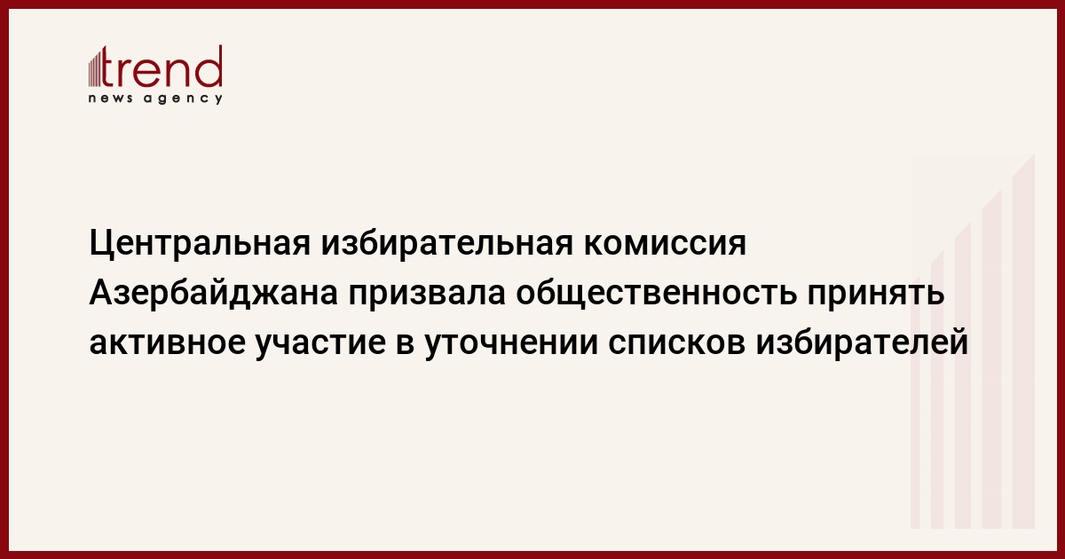 Азербайджан, Баку, 12 августа /корр. Trend Э.Бабаев/ Центральная избирательная комиссия (ЦИК) Азербайджана призвала общественность принять активное участие в уточнении списков избирателей.