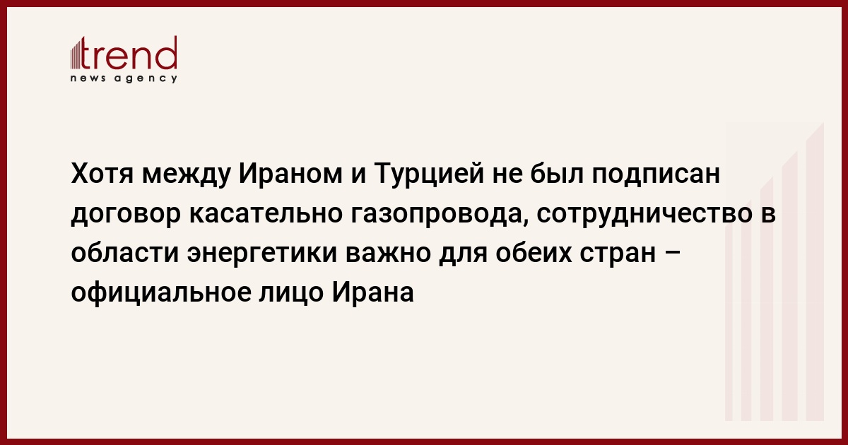 Азербайджан, Баку, 16 августа /корр. Trend Р.Азадбахш/ Несмотря на то, что президент Ирана во время своего официального визита в Турции не достиг соглашения касательно подписания договора по экспорту газа, официальный Тегеран придает большое значение сотрудничеству с Анкарой по вопросу энергетики. "Хотя между Ираном и Турцией не был подписан договор касательно газопровода, сотрудничество в области энергетики важно для обеих стран", - сказал Trend в Тегеране официальное лицо министерства торговли Ирана и политический эксперт Амин Чарусе.