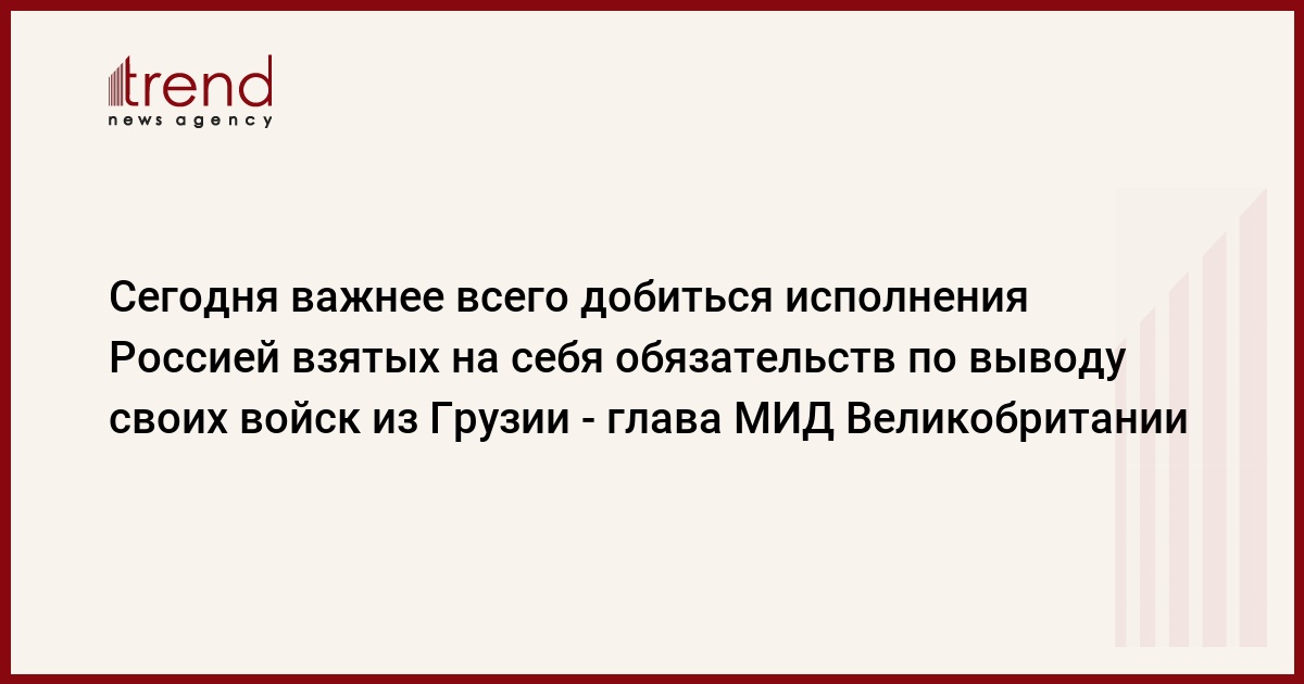 Грузия, Тбилиси 20 августа /корр. Trend Н.Кирцхалиа/ Сегодня важнее всего добиться исполнения Россией взятых на себя обязательств по выводу своих войск из Грузии, а не рассуждать о том, какие меры будут приняты, если Москва не выполнит обещания, заявил на совместном брифинге с президентом Грузии министр иностранных дел Великобритании Дэвид Миллибанд.
