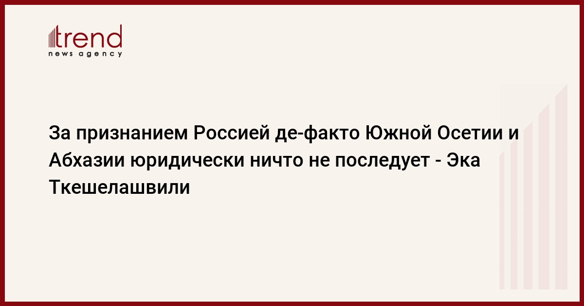 Грузия, Тбилиси, 22 августа /корр. Trend Н.Кирцхалиа/ За признанием Россией де-факто Абхазии и Южной Осетии юридически ничто не последует. Об этом по окончании встречи с председателем ОБСЕ и министром иностранных дел Финляндии Александром Стаббом заявила глава внешнеполитического ведомства Грузии Эка Ткешелашвили.