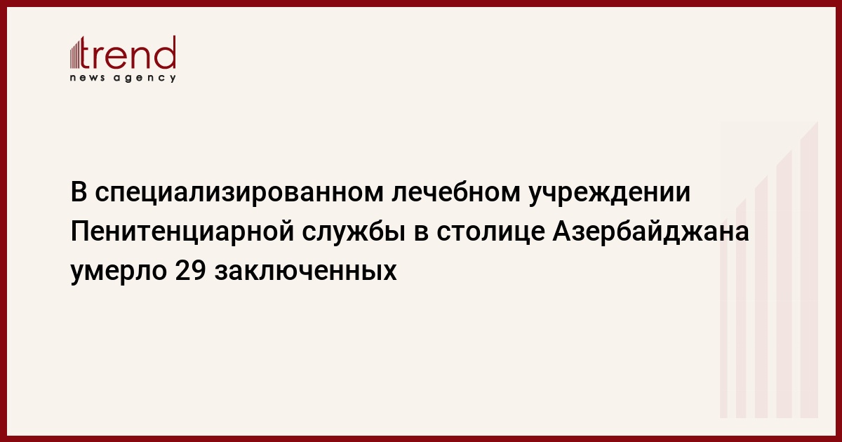 Азербайджан, Баку, 22 августа /корр. Trend С.Кязымлы/ В этом году в специализированном лечебном учреждении Пенитенциарной службы (для заключенных, страдающих туберкулезом), находящемся в Баку, из-за болезни умерло 29 заключенных. Об этом в пятницу корреспонденту Trend сообщил начальник учреждения, полковник Низами Гулиев.