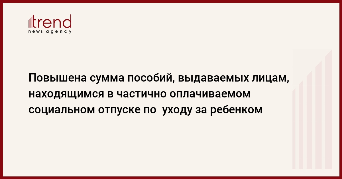 Азербайджан, Баку, 27 августа / Trend / Президент Азербайджана Ильхам Алиев в среду подписал распоряжение о повышении суммы пособий, выдаваемых лицам, находящимся в частично оплачиваемом социальном отпуске по уходу за ребенком. Согласно распоряжению главы государства, сумма месячного пособия, выплачиваемого лицам, находящимся в частично оплачиваемом социальном отпуске по уходу за ребенком в возрасте до 1,5 лет, составит 20 манатов, по уходу за ребенком от 1,5 до 3 лет - 10 манатов.