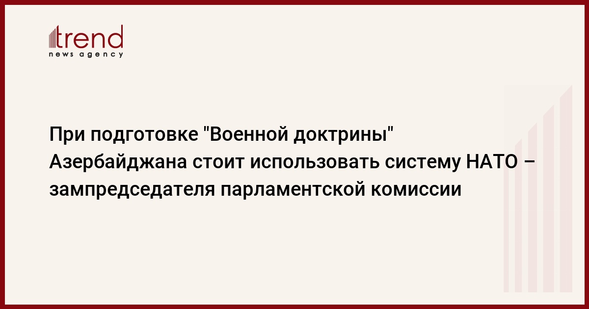 Азербайджан, Баку, 28 августа /корр. Trend И.Ализаде/ "Военная доктрина" Азербайджана должна быть подготовлена только на основе системы НАТО, отметил зампредседателя постоянной комиссии Милли меджлиса по вопросам безопасности и обороны Айдын Мирзазаде.