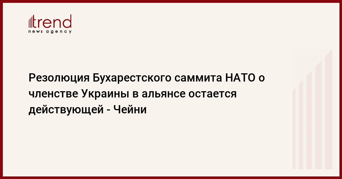 Украина, Киев, 5 сентября /корр. Trend З.Новосвитский/ Резолюция Бухарестского саммита НАТО о том, что Украина должна стать членом Североатлантического альянса, остается действующей. Об этом заявил вице-президент США Дик Чейни в Киеве во время оглашения совместного с президентом Украины Виктором Ющенко заявления для СМИ.