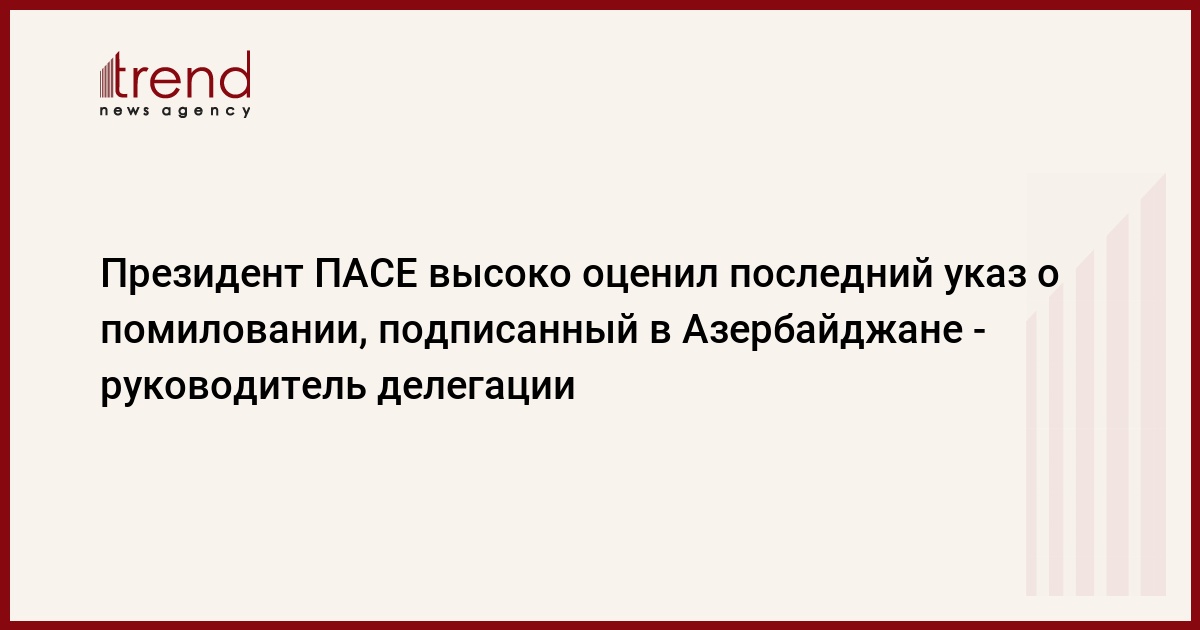 "Президент ПАСЕ на заседании структуры Бюро оценил последний указ о помиловании, как попытку уважительного подхода президента и правительства Азербайджана к европейским стандартам, принципам и ценностям Совета Европы", - сказал в пятницу Trend по телефону из Парижа вице-президент ПАСЕ, руководитель азербайджанской делегации в структуре Самед Сеидов.