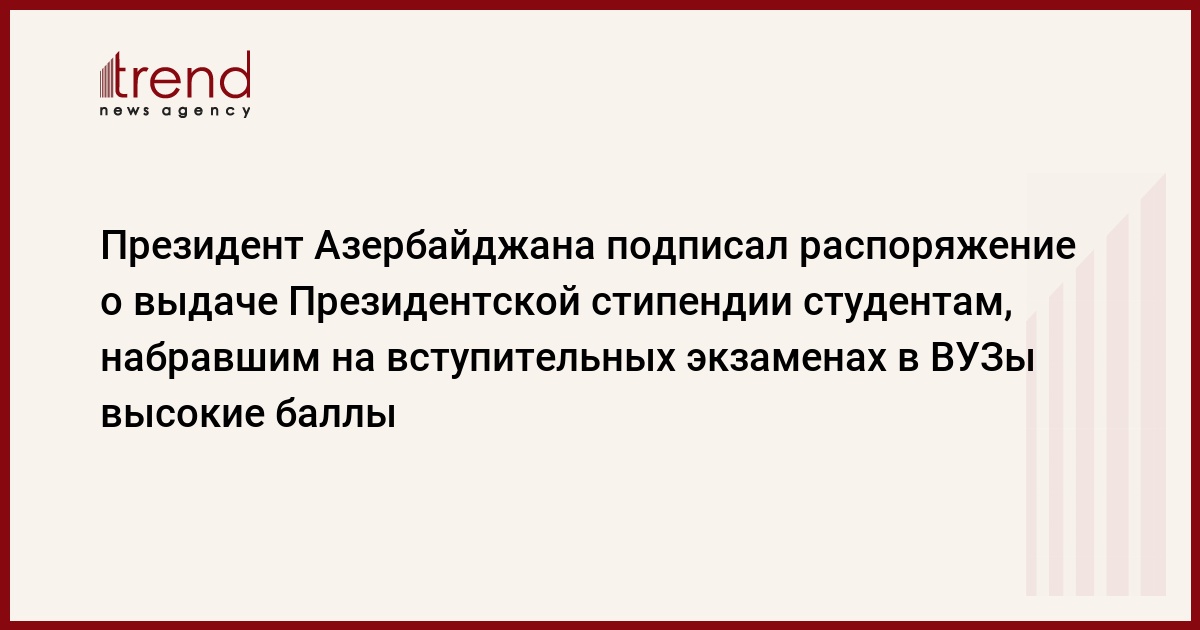 Азербайджан, Баку, 8 сентября /Trend News/ Президент Азербайджанской Республики Ильхам Алиев подписал в понедельник распоряжение о выдаче Президентской стипендии студентам, показавшим высокие результаты на вступительных экзаменах по группам специальностей в ВУЗы Азербайджана на 2008/2009 учебный год.