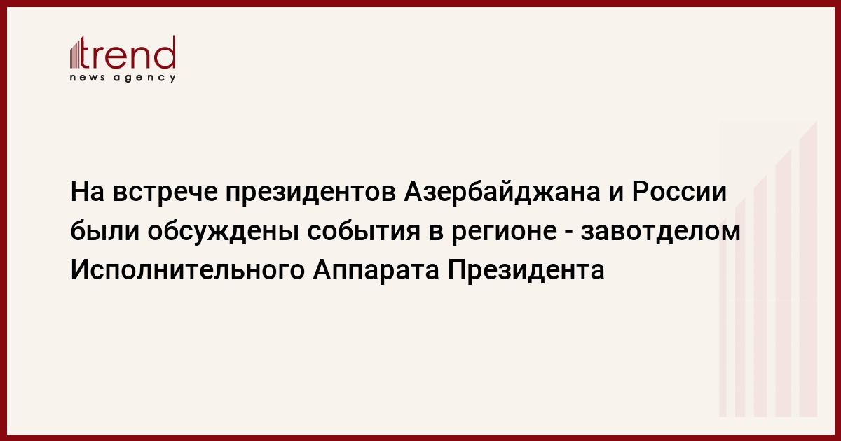Азербайджан, Баку, 16 сентября /корр. Trend К.Зарбалиева/ На встрече президентов Азербайджана и России Ильхама Алиева и Дмитрия Медведева были обсуждены все процессы, происходящие на Южном Кавказе, и пути их разрешения. Об этом сообщил во вторник журналистам начальник общественно-политического отдела Исполнительного Аппарата президента Азербайджана Али Гасанов. Отметивший, что оба государства занимают на Кавказе ведущую позицию, Гасанов заявил, что происходящие в регионе процессы воздействуют на оба государства, как в положительном, так и в отрицательном аспекте. Он сказал, что на встрече президентов объектом обсуждений также стали двусторонние отношения. По словам Гасанова, так как роль Азербайджана в регионе является значительной, не учитывать мнение и позицию Азербайджана в поисках путей выхода из сложившейся ситуации невозможно.
