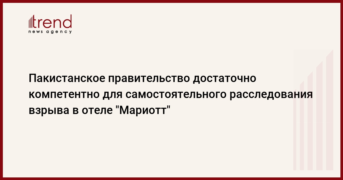Азербайджан, Баку, 23 сентября /корр. Trend Д.Ибрагимова/ Пакистан отказался от помощи США в проведении расследования взрыва в отеле "Мариотт", чтобы доказать свою компетентность и непредвзятость в расследовании.