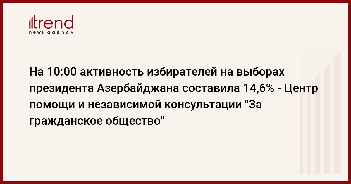Азербайджан, Баку, 15 октября /корр. Trend Шахин Джавадсой/ Согласно информации Центра помощи и независимой консультации "За гражданское общество", проводящего ехit-poll на президентских выборах в Азербайджане, на 10:00 по местному времени активность избирателей составила 14,6%.