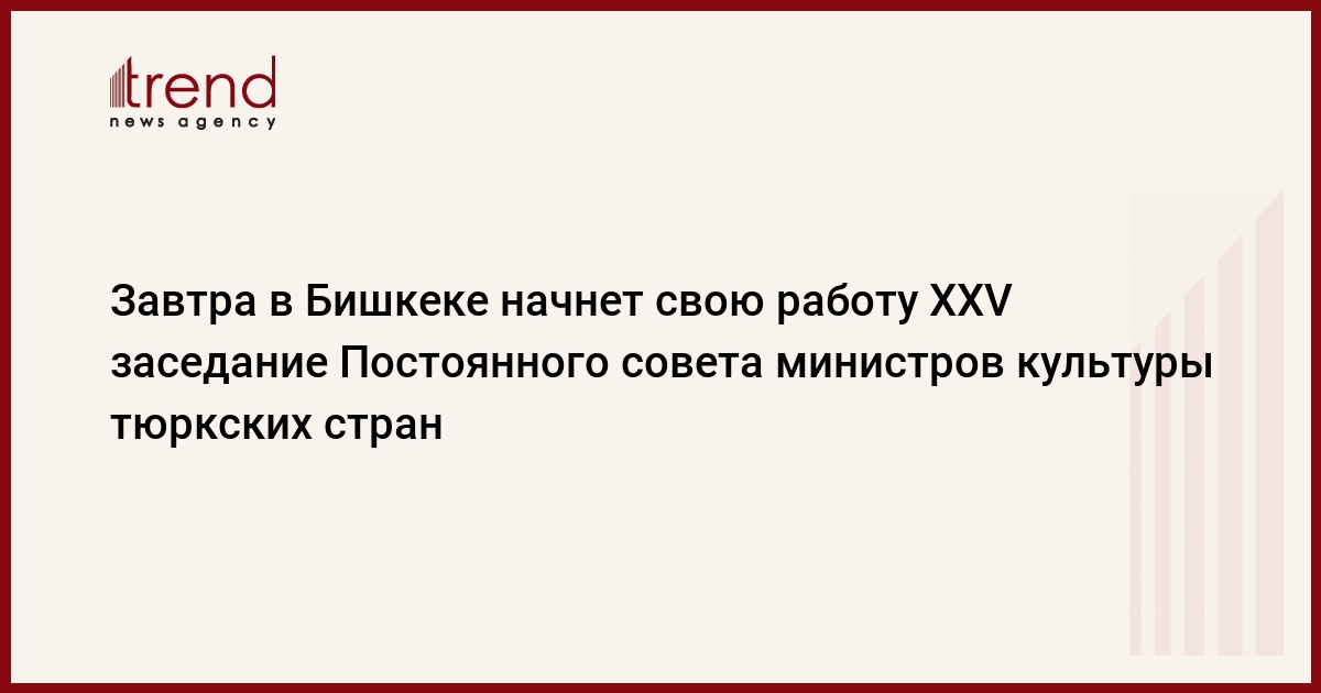 Кыргызстан, Бишкек, 23 октября /корр. Trend Р.Мешадигасанлы/ Завтра в Бишкеке в рамках празднования 80-летия со дня рождения Чингиза Айтматова состоится XXV заседание Постоянного совета министров культуры тюркских стран ТЮРКСОЙ, сообщили Trend в министерстве культуры Кыргызстана.