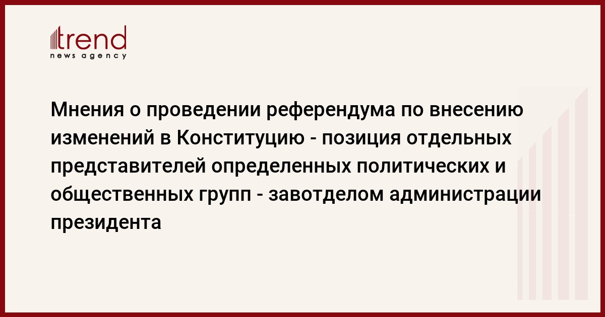 Азербайджан, Баку, 7 ноября /корр. Trend И.Ализаде/ Возможность проведения в Азербайджане референдума для исключения из Конституции статьи, запрещающей избрание одного лица на пост президента страны более двух раз, является инициативой отдельных представителей определенных политических и общественных групп с точки зрения перспектив развития государства.