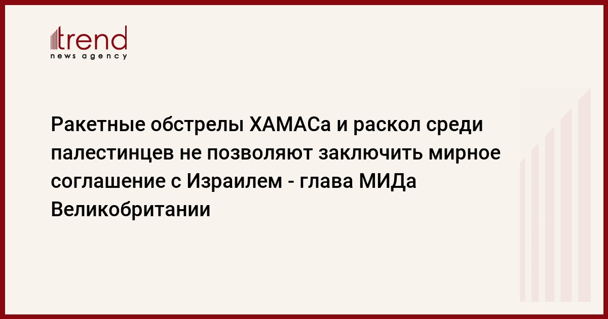 Глава британского МИД сказал также, что палестинская организация ХАМАС мешают заключению мира. Он отметил, что ракетные обстрелы и раскол среди палестинцев не позволяют заключить мирное соглашение, к которому должна стремиться и Сирия.