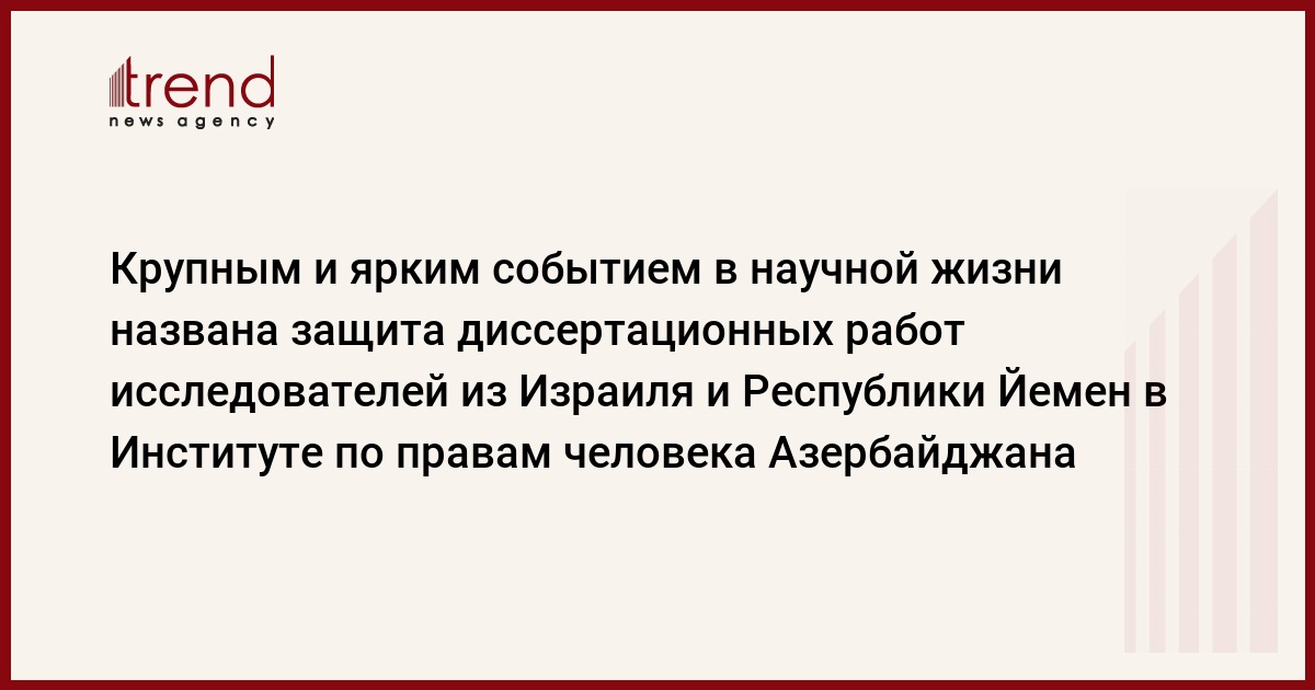 Азербайджан, Баку, 29 ноября /корр. Trend Р.Хафизоглу/ Крупным и ярким событием в научной жизни не только нашей страны, назвал представитель посольства Израиля в Азербайджане Михаил Баркан, состоявшиеся накануне защиты диссертационных работ исследователей из Израиля и республики Йемен в Институте по правам человека НАН Азербайджана.